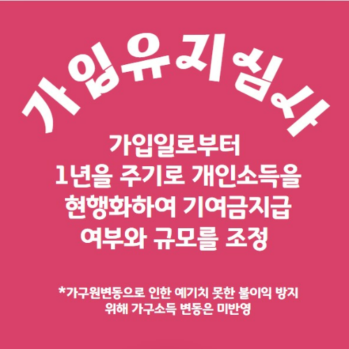 이 부분이 조금 까다로울 수 있습니다. 가입일로부터 1년을 주기로 개인소득을 최신화하여 기여금 지급여부와 규모를 조정한다는 내용입니다. 즉, 가입 당시 기업기여금 등 지원금을 최대로 받을 수 있더라도 추후에 소득이 늘어남에 따라 지원금이 줄어들 수도 있다는 이야기입니다. 유지심사 결과에 따라 개인소득 6,000만원 초과시 다음 유지심사시까지는 정부기여금 지급이 중단되니 참고하시길 바랍니다.