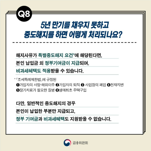 돈을 꾸준하게 납입해야하는 5년이 결코 짧지 않은 기간이기 때문에 중도해지가 발생할 수도 있습니다.